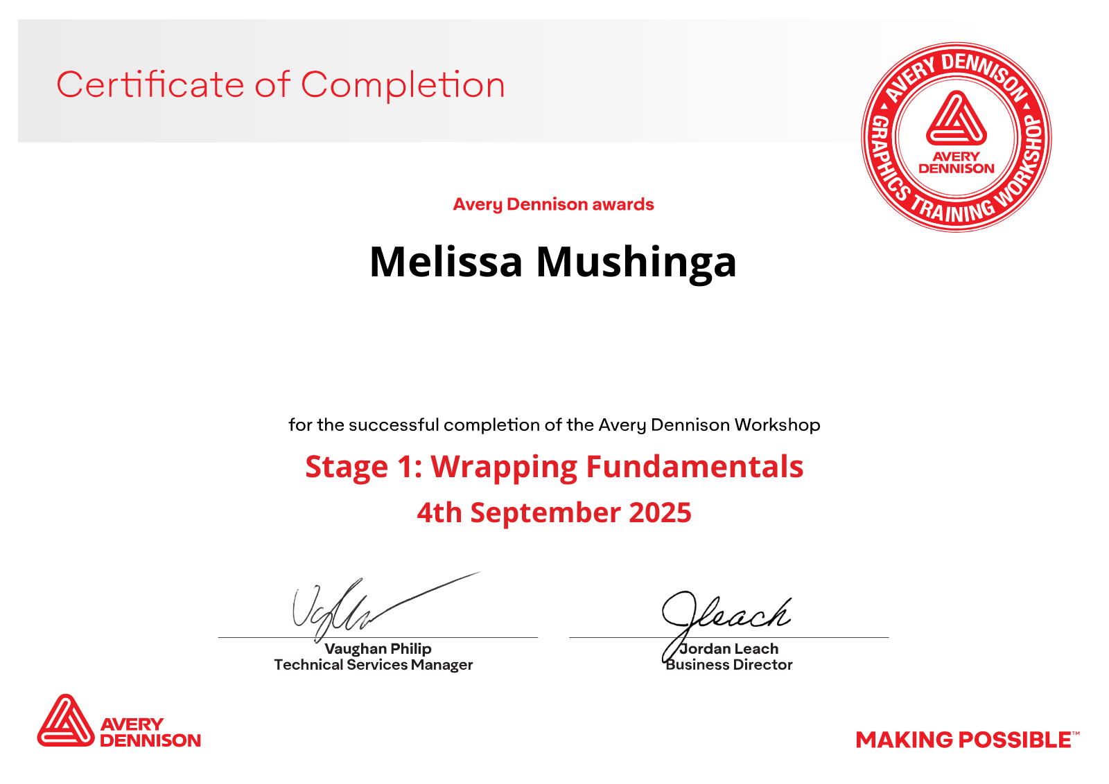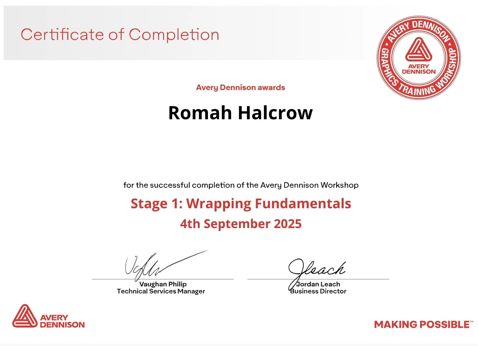 We have completed The Avery Dennison® Stage 1: Wrapping Fundamentals workshop, and continually refine our techniques to stay ahead of industry trends.